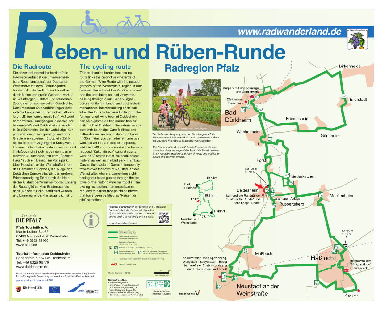 Nicht nur für Rollstuhlfahrer ist der Barrierefreie Radweg, die Reben- und Rübenrunde, die 2024 eingeweiht wurde und zwischen Neustadt und Bad Dürkheim eine gut ausgebaute barrierefreie Runde bietet.