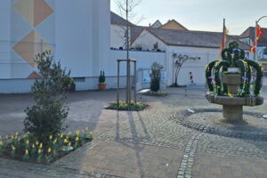 Pünktlich zur Osterzeit erstrahlt unser Dorfplatz wieder in frühlingshaftem und österlichem Schmuck, mit dem schön dekorierten Osterbrunnen, samt Hasenfamilie.