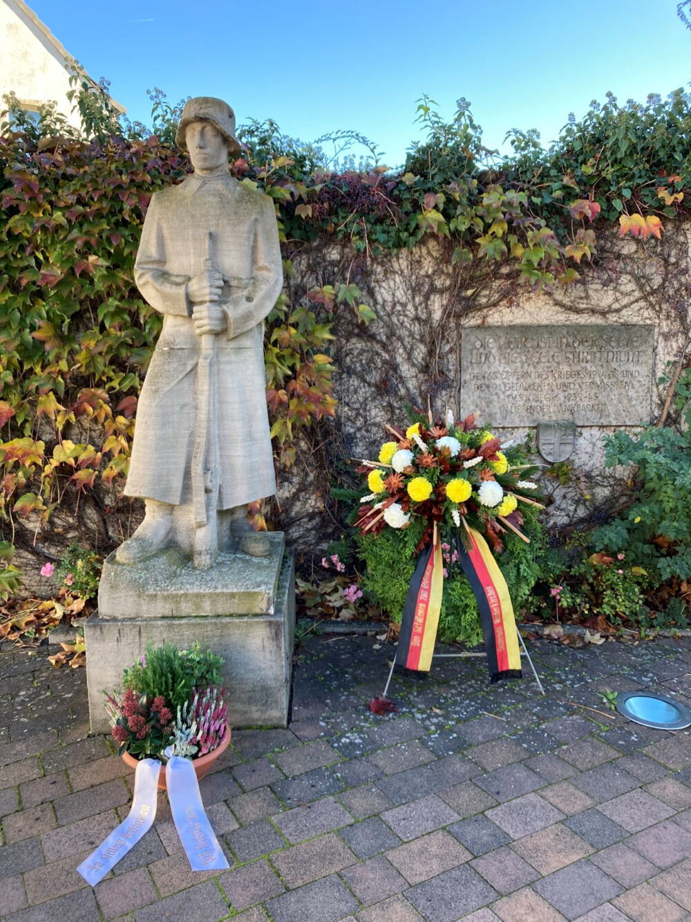 Als äußeres Zeichen unserer Anteilnahme hat die Gemeinde und der VdK am Kriegerdenkmal einen Kranz und eine Blumenschale niedergelegt.
